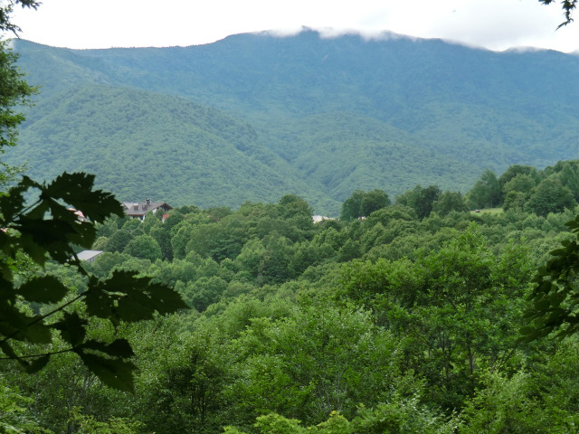 ![]() 見晴らし台よりペンション村越しに岩菅山を臨む |