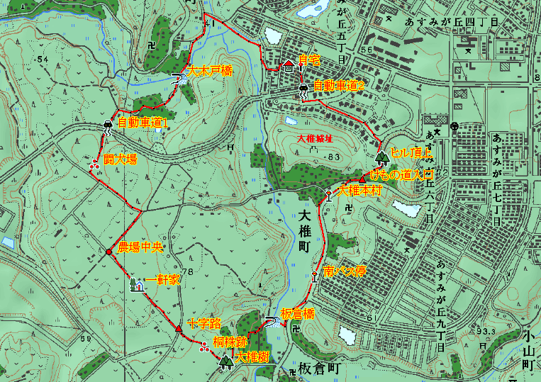 国土地理院の2万5千分の1に自宅周辺のウォーキング・ルートを描いた例