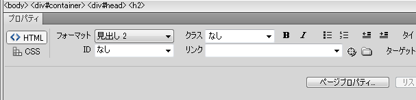 上のプロパーティー・インスペクターの例ではドキュメント・ウィンドウ内で選択された要素が「フォーマット」欄で「見出し2」であることを示しています。このことは、すぐ上のステータス・バーのタグ・セレクターでも示しています。また、逆に「フォーマット」欄の右側にある▼をクリックすることによってタグの種類の変更も出来ます。