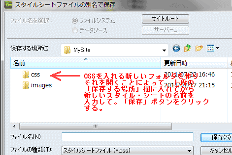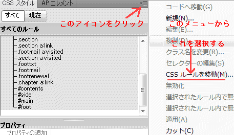 「CSSスタイル」パネルの「すべて」タグを選んで表示されるすべてのルールを選んでハイライトさせてから、「CSSスタイル」タイトルの最右端にあるアイコンをクリックし、プルダウン・メニューから「CSSルールを移動」を選びます。 表示された「スタイル・シート・ファイルの別名で保存」ダイアログ・ボックスにCSSのフォルダを作成して、その中に新しいスタイルシートの名前を付けて保存すれば、内部CSSは外部CSSに書き出されます。 そのことは「ファイル」パネルに「CSS」フォルダーが作成され、その中にスタイル・シートのファイルが作成されたことで確認できます。 |