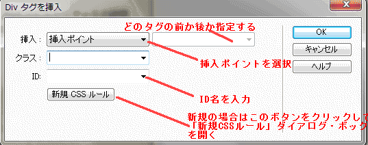 <Div>タグの挿入は、白紙のページに新たにレイアウトを付ける場合はページ左端のトップにポインターを置き、既にコンテンツが入力されている場合は囲むべき範囲を選択してから行います。 その上で、「挿入パネル」の「一般」の中の「Divタグを挿入」を選んでクリックすると「Divタグを挿入」ダイアログ・ボックスが表示されます。 「挿入パネル」が表示されていない時は、「ウィンドウ」メニュでー「挿入」をクリックすると画面右側に表示されます。 |