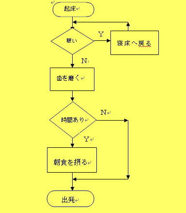 ここでいう一定の手順に従った処理とは下のフローチャートで表されるような処理のことです。この処理は、朝の起床から出発までのある人の行動を一定の手順に沿って表したものです。
