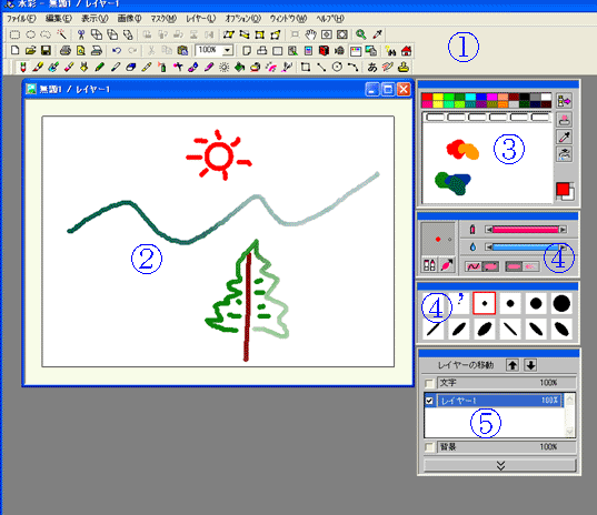 実際に絵を描く場合は、用意されている24種類の色では十分自分の求める色を出すことが出来ませんので、用意されている絵の具を複数調合して求める色を出すことになります。この調合は実際の水彩画を描く時と同じようにパレットの上で行います。例えば、最初に赤の絵の具を選んでパレットの上に練りだします。その上に黄色の絵の具を選んでパレットの上にある赤の上に重ね塗りすると調合具合次第で微妙な橙色が出来ます。勿論、この時作られた橙色はインジケータに表示されて、新たな色が選択されるまで選択された色として有効として残っています。 色の調合を行う場合は@の部分の描画ツールの中の最左端の筆を選び、C’の中の右から3番目の筆に太さを選ぶと良いと思います。調合した色が濃すぎる場合は白の絵の具を混ぜ合わせるとよいと思います。 色の調合の仕方も、追加する色を追加される色の外側から混ぜ合わせる場合と、追加される色の中側に練りこむ方法とがありますが、当然前者の方法の調合の方が後から追加する色の影響がより強く出ます。 Bパレットの右側に4つのツール・ボックスが用意されています。 2番目のツール・ボックスは色の保存の道具です。例えば、人の肌色のような色は調合に苦労します。このように苦労して調合した色を保存しておいて、後で何回もその色を使いたい場合には24種類の絵の具の下側に6箇所の独自に調合して色を保存しておく場所が用意されていますので、そこに保存しておけばよいのです。 勿論、パレット上で調合した色を、スポイトで選択してから、この色の保存の道具箱をクリックしますと、マウス・カーソルがピーカーに変わります。このピーカーで色の保存場所をクリックすれば選択した色はその保存場所に保存されます。保存色を変更するには、新しい保存色を上書き保存すれば出来ます。 3番目のツール・ボックスはスポイトです。これは一旦パレット上で調合した色を選んだり、或いはキャンバス上に書き込んだと同じ色を選択したい場合に非常に便利です。 4番目のツール・ボックスはパレットを洗う道具です。これをクリックするとパレット上の全ての色が洗われてしまいますので、保存したい色は保存場所に保存しておかなければなりません。 |