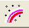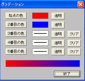 次に、グラデーションのアイコンをクリックすると、右の上の図のようなオプション・ウィンドウが表示されます。そこには一応出来合いのグラデーションのサンプルが用意されていますが、当然目指すものと違いますので、それを変更する操作に入ります。 先ず、グラデーションの方向の指定窓がそのサンプルの右横にありますので、下向き▼をクリックして、縦か横か円か右下がりか、或いは左下がりを選びます。そして、その右横の変更ボタンをクリックします。 すると、右の下の図のようなグラデーション・ウィンドウが表示されます。そこで、始点の色、2番目の色、・・最後の色を指定するのですが、始点の色や2番目の色のボタンをクリックすると、マウス・ポインターが色を吸い取る為のスポイドに変わりますので、それで好みの色を指定すれば良いのです。色の指定は5つまで出来ますが、必ずしも全部指定する必要はありません。 色の指定が全部終わりましたら、終了ボタンをクリックして下さい。するとマウス・ポインターがバケツ・アイコンに変わりますので、そのバケツ・アイコンで指定の範囲をクリックしますと、その範囲がグラデーション色で塗り潰されます。