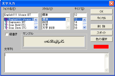 | そのウィンドウで文字のフォント、スタイル、サイズを指定し、スポイト・ボタンをクリックして文字色を指定してから、文字列の枠の中に書き込みたい文字を入力し、OKボタンをクリックすれば文字入力は完了です。文字の場所はドラグすることで動かせます。 |