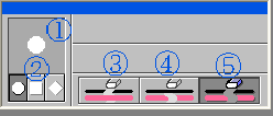 | 消しゴムもなくてはならない描画ツールです。消しゴムを選択すると右図のようなオプション・ウィンドウが表示されます。 @は消しゴムの大きさ Aは消しゴムの形を指定します。 B、C、Dは消しゴムの働き方のモードを指定する大変便利な機能です。 Bは鉛筆やペンで描いた下絵の線だけを消す指定です。 Cは下絵の線を残して絵具だけ消すことを指定します。 Dは下絵と絵具の両方を消すよう指定するとき使います。