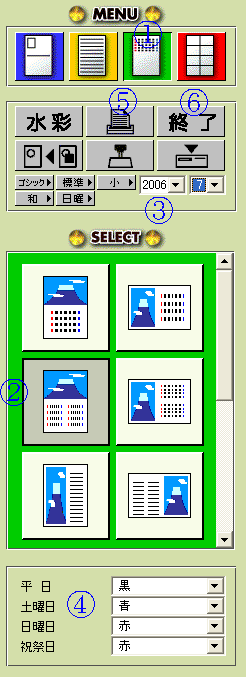 先ず、水彩7を立上げ、自動的に表示される空白のキャンバスをキャンバス右上端のXマークをクリックして削除します。空白のキャンバスがなくなった状態で、ファイル・メニューから「開く」を選んで、ハガキに配置したい絵(JPG形式の写真でも可)をキャンバスに読み込みます。 次に、ツール・ボックスの中の @のMenuの中から右から2番目のカレンダー作成ボタンをクリックすると、Aのようにカレンダーの形式を指定するSELECTメニューが表示されます。 選択できる6種類のカレンダーの形式から、絵や写真の配置を選択したり、1枚の中に1ケ月のカレンダーを埋め込むか、2ケ月のカレンダーを埋め込むかの選択が出来るようになっています。 例えば、6種類の選択肢の中から左側2段目の形式を選択すると、カレンダーの上段に選択した絵が配置され、下段に2ケ月分のカレンダーが埋め込まれるような形式が選択されます。 Bでカレンダーのフォントの種類やサイズを指定し、その頁に埋め込むカレンダーの年月を指定するようになっています。上の例ですと、1頁に2ヶ月分のカレンダーを埋め込む指定なので、ここではその始めの年月を指定します。 Cでカレンダーのフォントの色を平日、土曜日、日曜日、祝祭日別に指定出来るようになっています。初期設定では通常使われるような設定になっていますので、このままでよければ変更する必要はありません。